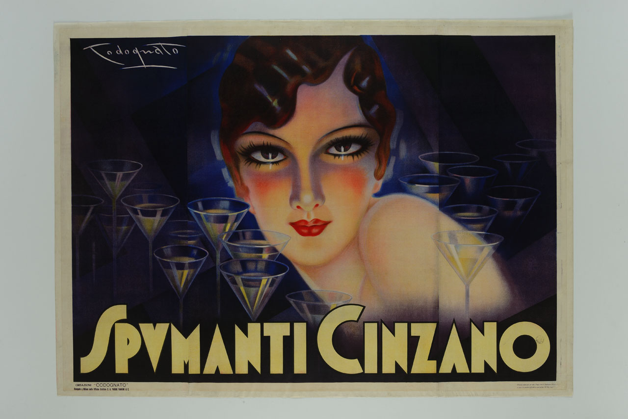 volto femminile con capelli "garconne" tra bicchieri a calice (manifesto)