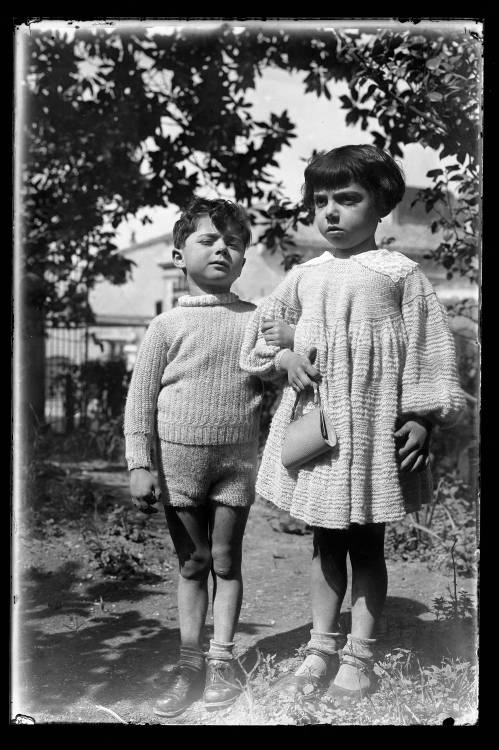 Ritratti fotografici - Fanciulli, Ritratto di due bambini in giardino. A sinistra un bamnino e a destra una bambina con un a borsetta