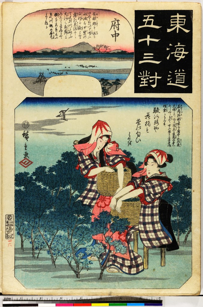 donne con ceste che raccolgono foglie di té e paesaggio nello sfondo (stampa, serie)