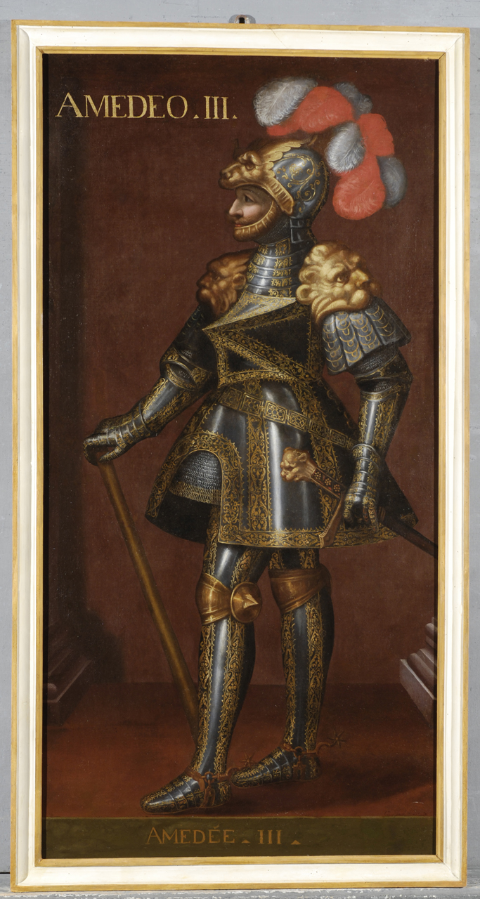Cornice di legno verniciato in bianco con filettature gialle. PERSONAGGI: Amedeo III. ABBIGLIAMENTO: corazza; elmo. ARMI: bastone del comando; spada. ELEMENTI ARCHITETTONICI: colonna