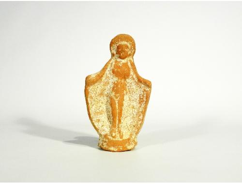 Figura femminile stante con arti superiori scostati dal corpo a reggere il mantello che ricopre anche il capo. Alta pettinatura, orecchini globulari.