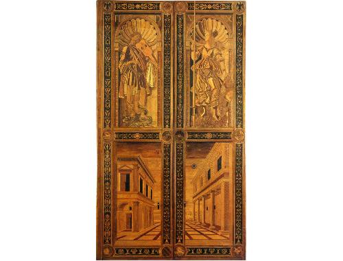 La porta, a due battenti, è riccamente intarsiata sul lato della Sala degli Angeli, mentre in quello del Salone d'Onore presenta ad intaglio dei rosoni lignei. Nella parte alta del lato ad intarsio sono raffigutati entro nicchie a conchiglia Apollo e Minerva (Apollo impugna uno strumento a corda con archetto e calpesta un drago; Minerva tiene una lancia con la punta rivolta verso il basso e uno scudo). Nella parte inferiore compaiono due palazzi in scorcio su una pavimentazione prospettica; in lontananza appare un paesaggio collinare. Un fregio, sempre ad intarsio, incornicia tutte le raffigurazioni e contiene simboli ed onorificenze feltresche: aquila, ermellino, chiavi pontificie, tiara papale, fiammelle, granata, struzzo, ordine della giarrettiera, collare dell'ermellino e stemmi dei Montefeltro.