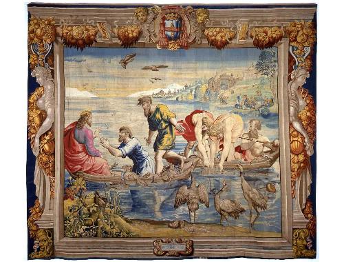 Personaggi: Gesù; San Pietro; Sant'Andrea; San Giovanni; Santo; rematore. Mare. Mezzi di trasporto: barche. Paesaggi: città di Cafarnao; città fortificate; colline; cielo. Figure maschili. Figure femminili. Montagne. Animali: pesci; uccelli. Vegetali. Piante. Araldica: stemma del cardinale Mazzarino. Decorazioni: cornice; mascheroni; cariatidi; volute; festoni di frutta e di vegetali; mensole; putti