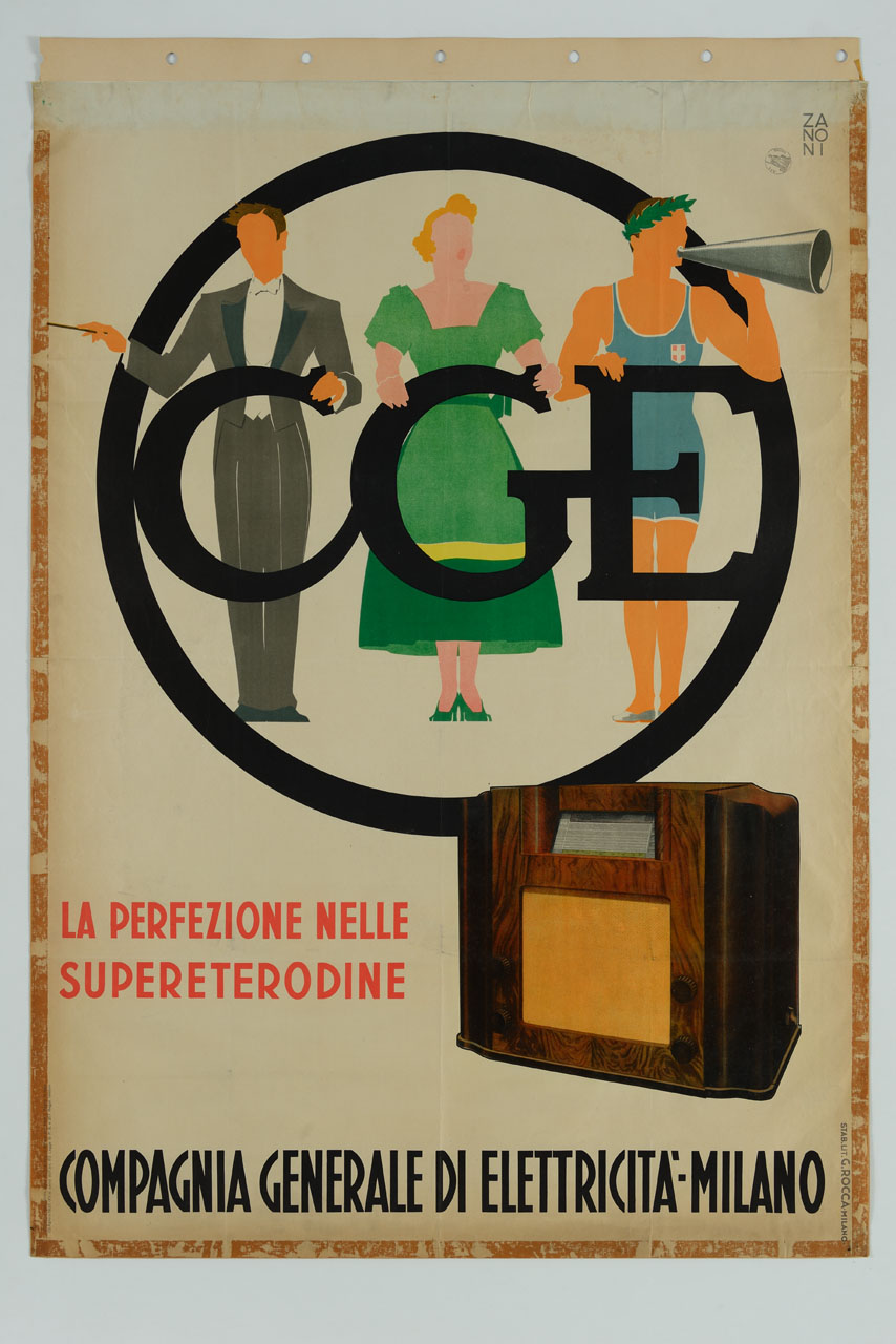 Lettura iconografica: figure maschili; direttore d'orchestra; atleta; figura femminile; megafono; radio. Categoria merceologica/ tipo evento: industria elettrica; apparecchiature elettroniche; generatori; trasformatori; apparecchi elettrici; elettrodomestici; frigoriferi; industria elettronica; apparecchi audio e video; radio. Nomi: CGE; Compagnia Generale di Elettricità. Luoghi: Milano