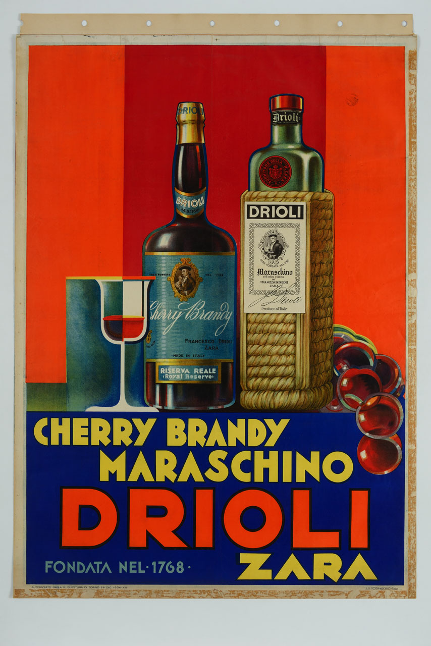 Lettura iconografica: ciliegie; bottiglie di liquore; bottiglia impagliata; bicchiere. Categoria merceologica/ tipo evento: industria alimentare; bevande; liquori; cherry brandy; maraschino. Nomi: Cherry Brandy; Maraschino; Francesco Drioli; Freancesco Salghetti Drioli. Luoghi: Italia; Dalmazia; Croazia; Zara; Zadar