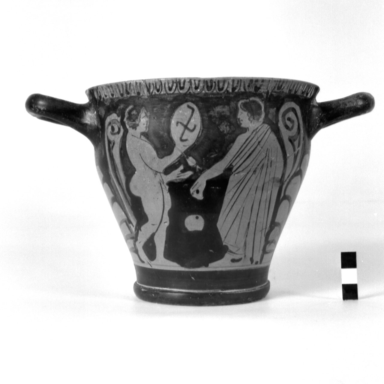 Labbro lievemente estroflesso con orlo arrotondato; vasca con carena arrotondata fortemente rastremata verso il piede ad anello; anse oblique, a bastoncello, sotto l' orlo.. A-B: atleta con disco in mano e giovane ammantato, affrontati; sotto le anse: palmetta tra tralci a voluta
