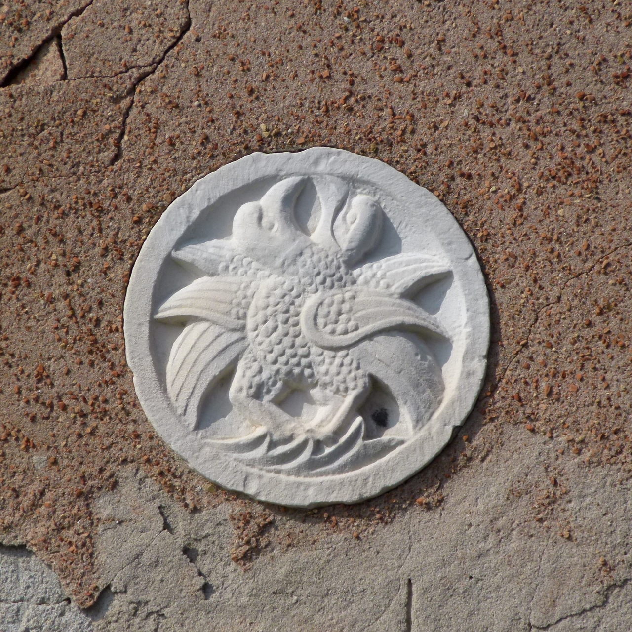 rilievo raffigurante coppia di colombe affrontate con i becchi congiunti. Definito da cornice a listello piatto. allegorie-simboli
