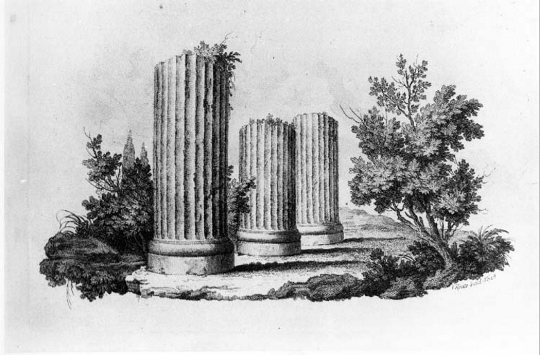 Colonne - riproduzioni fotografiche; Volpato, Giovanni (1735/ 1803). Karolo III Hispan. et Indiar.; Volpato, Giovanni (1735/ 1803) - incisioni; Paoli, Paolo Antonio. Rovine della città di Pesto, detta ancora Posidonia - illustrazione, libri, Dal libro "Rovine della città di Pesto, detta ancora Posidonia" dello scrittore Paolo Antonio Paoli: riproduzione da stampa di colonne dal sito di Paestum