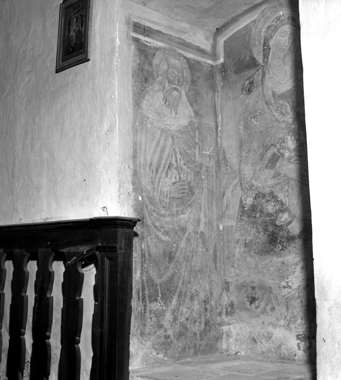 dipinto. Personaggi: Madonna; Gesù Bambino; Sant'Antonio Abate. Attributi: (Sant'Antonio Abate) libro; bastone. Decorazioni: cornice a linee parallele
