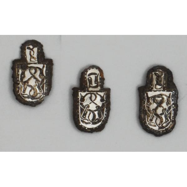 3 placchette con forma a U, con apice anch'esso a U. Sul retro tracce di occhielli per il fissaggio. La decorazione in agemina alterna ottone e argento. Il contorno è arricchito da una decorazione perlinata entro un filetto lineare.. Il modulo del disegno è costituito dalla successione di quattro serpenti che si mordono la coda, con andamento a doppio cappio entro una doppia voluta che occupa l'intero registro a mo' di cornice. L'apice è decorato con diverso modulo in due esemplari su tre: nel primo caso (su due placchette) si ripete il modulo a otto del doppio serpente semplificato e monocromatico; nel secondo (su un'unica placchetta) sono rappresentati due serpenti che si mordono la coda, in successione entro uno spazio rettangolare