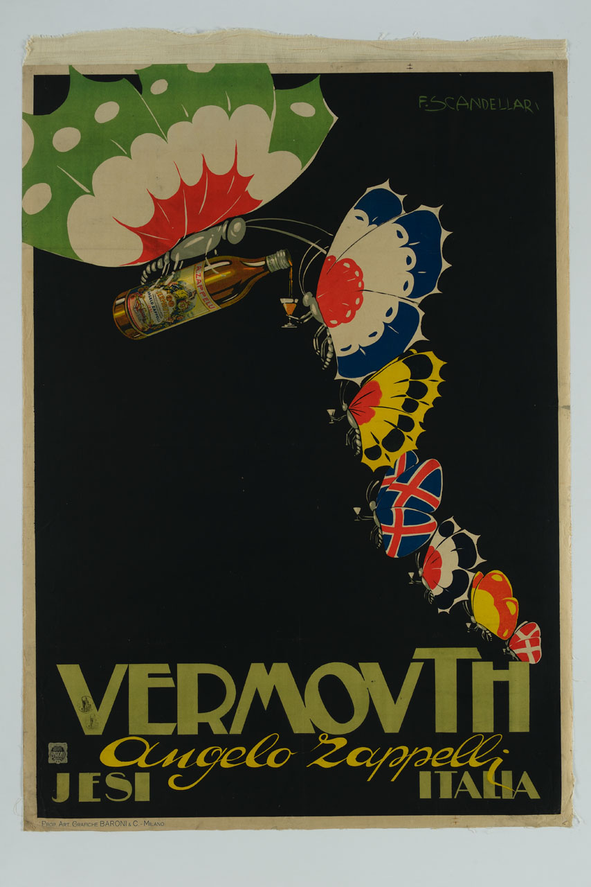 Lettura iconografica: bottiglia di liquore; bicchieri; farfalle; bandiere. Categoria merceologica/ tipo evento: industria alimentare; bevande; vini speciali; vermut. Nomi: Angelo Zappelli. Luoghi: Ancona; Jesi