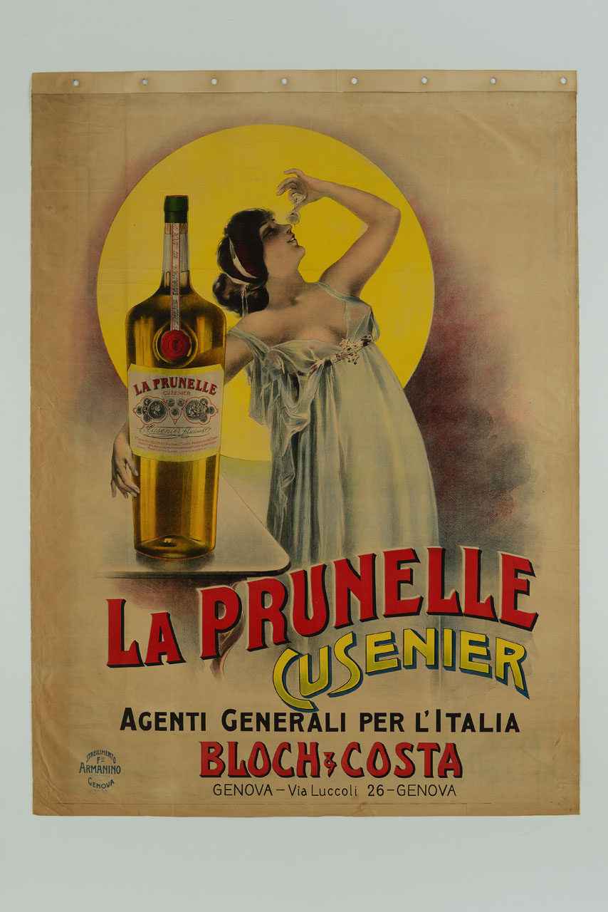 Lettura iconografica: figura femminile; bicchiere; bottiglia; luna. Categoria merceologica/ tipo evento: industria alimentare; bevande; liquori; liquore alla prugna. Nomi: La Prunelle Cusenier; E. Cusenier; Bloch Costa. Luoghi: Genova; Francia; Parigi; Ornans; Charenton; Marsiglia; Mulhouse; Cognac; Chateau du Solencon; Belgio; Bruxelles; Messico; Argentina; Buenos Aires