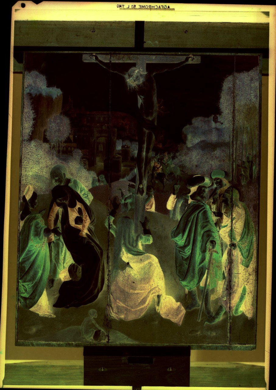 Crocifissione di Cristo; olio su tavola; Maestro della Virgo inter Virgines, L'opera si trova alla Galleria degli Uffizi (Palazzo degli Uffizi) inv. 1890 n. 1237 GR 6882; scheda OA 0900286963 e fu restaurata da Vermehren nel 1974. Negativo a colori