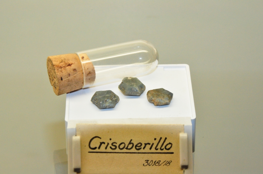Il campione è costituito da tre cristalli di crisoberillo, varietà Alexandrite su cui sono applicati dei cartellini con i relativi numeri di inventario. Hanno abito prismatico tozzo pseudoesagonale, dovuto alla geminazione fra tre individui lungo il piano (0,3,1), in realtà appartengono al sistema rombico piramidale. I cristalli sono di colore verde intenso, molto torbido a volte tendente al bianco. Sul campione 6132 è possibile vedere, su uno dei pinacoidi, una struttura (a forma di trifoglio) a gradini; dovuta all'accrescimento. hanno tutti lucentezza vitrea, tendente a quella grassa. Il campione con num. inventario 156 è fratturato fra due facce. Il campione num. 6132 osservato allo stereomicroscopio, a luce riflessa, appare diviso in zone di colore diverso e presenta tasche di erosione. Da uno dei bordi, sembrano emergere altri cristalli. Ruotandolo, appare pleocroico con colorazioni dal verde al grigio.. località di raccolta - dati storici: Asia, Oural , Siberia, Tokowaja