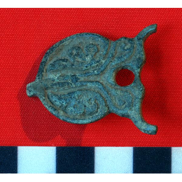 Placca tondeggiante, non traforata,decorata con motivo vegetale stilizzato. La fibbia e ardiglione mancanti. Sul retro permangono due boncinelli, di cui uno frammentario, per il fissaggio.