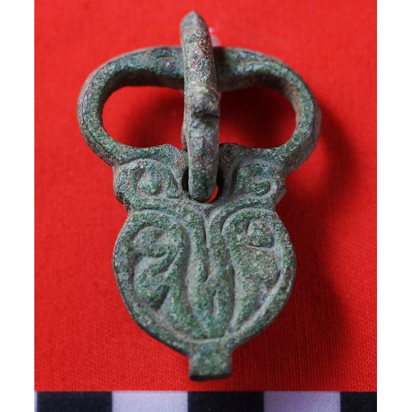 Placca tondeggiante, non traforata,decorata con motivo vegetale stilizzato. La fibbia è ovale, fissa, con ardiglione ricurvo con appendice superiore.