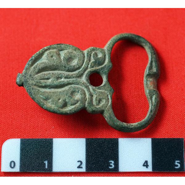 Placca tondeggiante, traforata,decorata con motivo vegetale stilizzato. La fibbia è ovale, con incavo d'alloggio ben marcato. Sul retro permangono due boncinelli, frammentari, per il fissaggio.