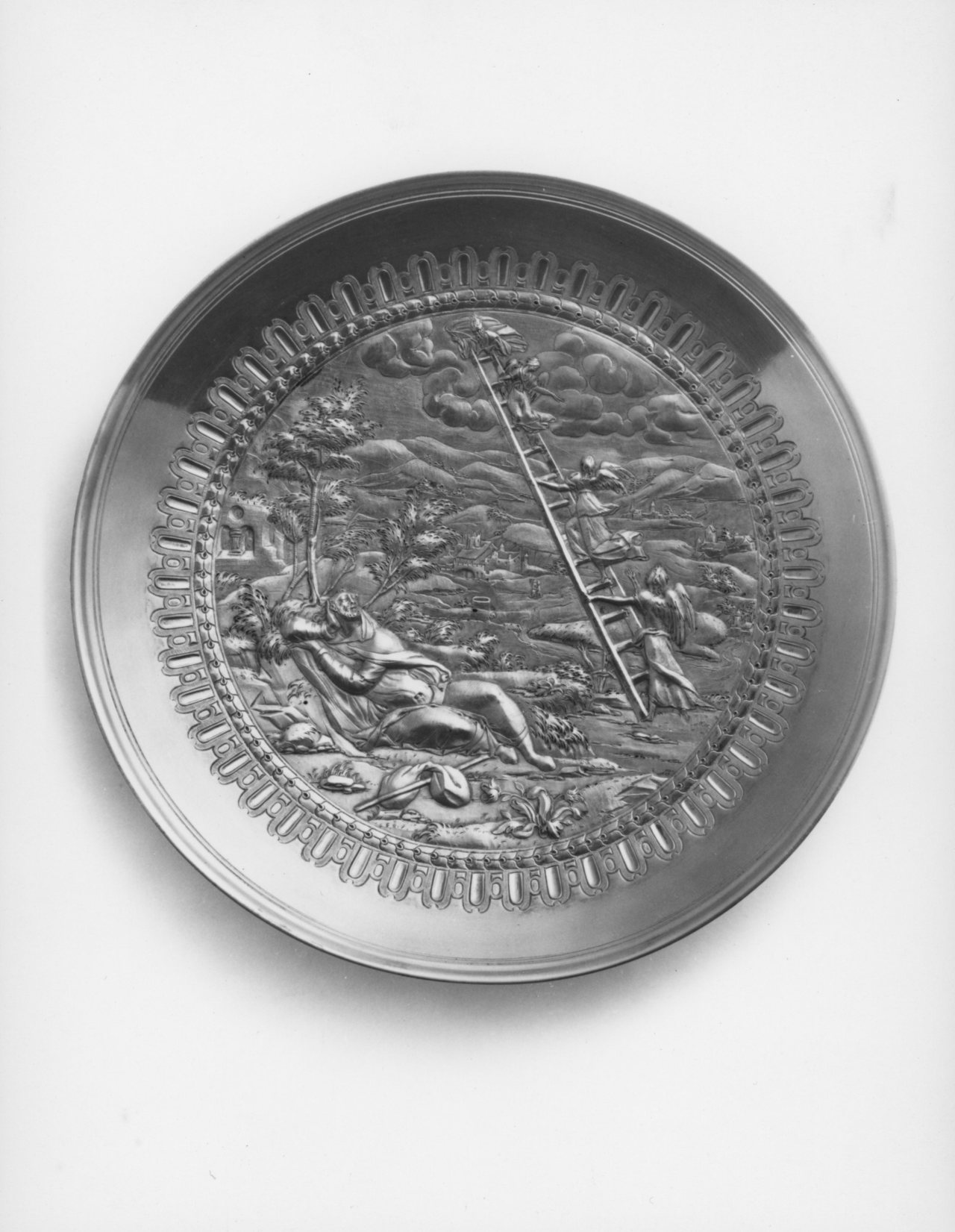Coppa ad alzatina provvista di piede circolare e di fusto ornato da tre aquile con il collo piegato sul petto. Personaggi: Giacobbe; Dio Padre. Figure: angeli. Oggetti: scala