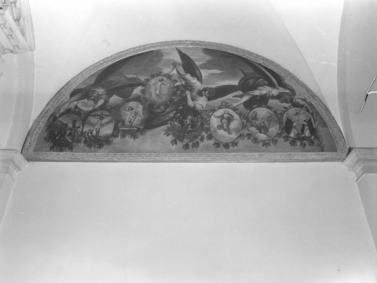 Iconografia già altre volte usata dal B. per rappresentare i misteri del Rosario entro piccoli medaglioni con cornice di foglie, appesi ad un nastro retto da tre angeli in volo. La cornice è di legno dorato (cfr. Notizie storico-critiche).. soggetto non rilevabile