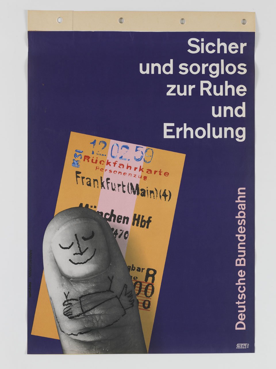 Lettura iconografica: pollice; biglietto del treno. Categoria merceologica/ tipo evento: trasporti; trasporto terrestre; compagnia ferroviaria; turismo; enti di promozione turistica. Nomi: DB; Deutsche Bundesbahn; WER; Bundesbahn Werbe und Auskunftsamt für den Personen und Güterverkehr. Luoghi: Germania; Frankfurt am Main; Francoforte sul Meno