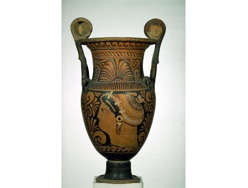 Orlo modanato, collo cilindrico, corpo ovoidale rastremato verso il basso, anse a volute con mascheroni, alto piede strombato e modanato. Decorazione accessoria: all''esterno dell''orlo, ovoli; collo: sul lato A, in alto serie di rosette,; sul lato B, in alto motivo a treccia, in basso palmetta impostata su volute; sulla spalla baccellature; sulle anse, maschere femminili con capelli ondulati; sotto le anse, palmetta impostate su volute. Rappresentazione: Lato A: sul collo, protome femminile fra due grandi ali con sakkos; sul corpo, sotto un''edicola con colonne ioniche su podio, figura femminile nuda seduta su diphros, con diadema, chitone, corona nella destra; a sinistra, figura femminile con chitone, sakkos, collana, specchio nella destra, corona nella sinistra; a destra, figura di atleta nudo con manto sul braccio, strigile nella destra, ramo di pino nella sinistra. Lato B: protome femminile con sakkos decorato, orecchino discoidale con pendente a grappolo, collana.