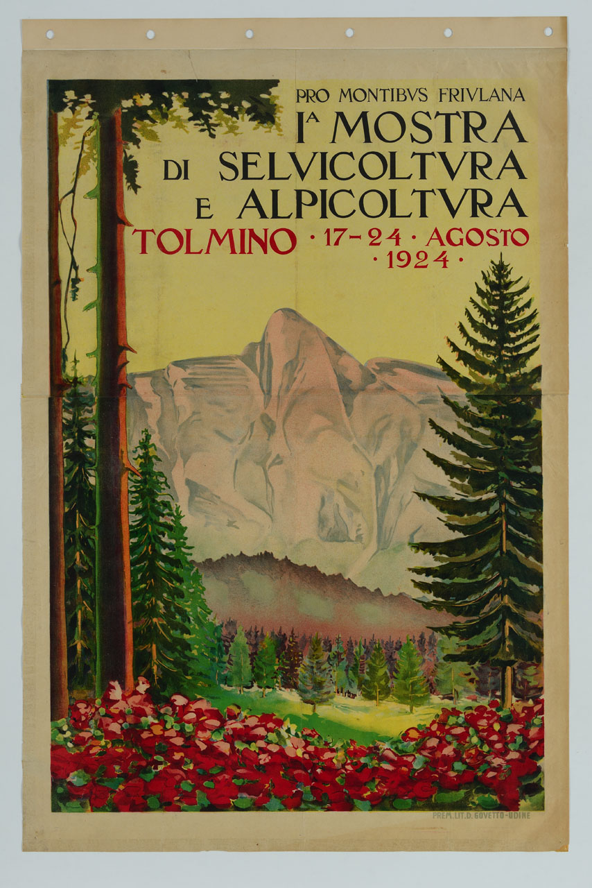 Lettura iconografica: paesaggio alpino; montagne; alberi; fiori. Categoria merceologica/ tipo evento: apicoltura; selvicoltura; mostre; associazioni di promozione turistica. Nomi: I Mostra di Selvicoltura e Apicoltura; Pro Montibus Friulana; Monte Nero. Luoghi: Slovenia; Tolmino