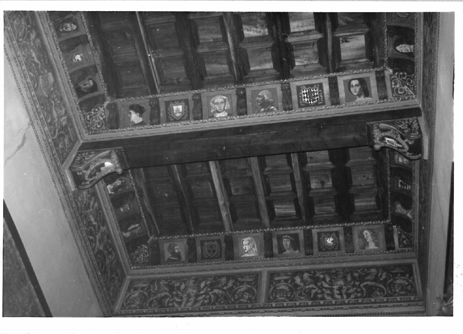Cremona - Architettura - Palazzi - Palazzo Raimondi Bellomi, Interno del palazzo. Particolare del soffitto a cassettoni ligneo con decorazioni fitomorfe e ritratti di vari personaggi dentro quadrati