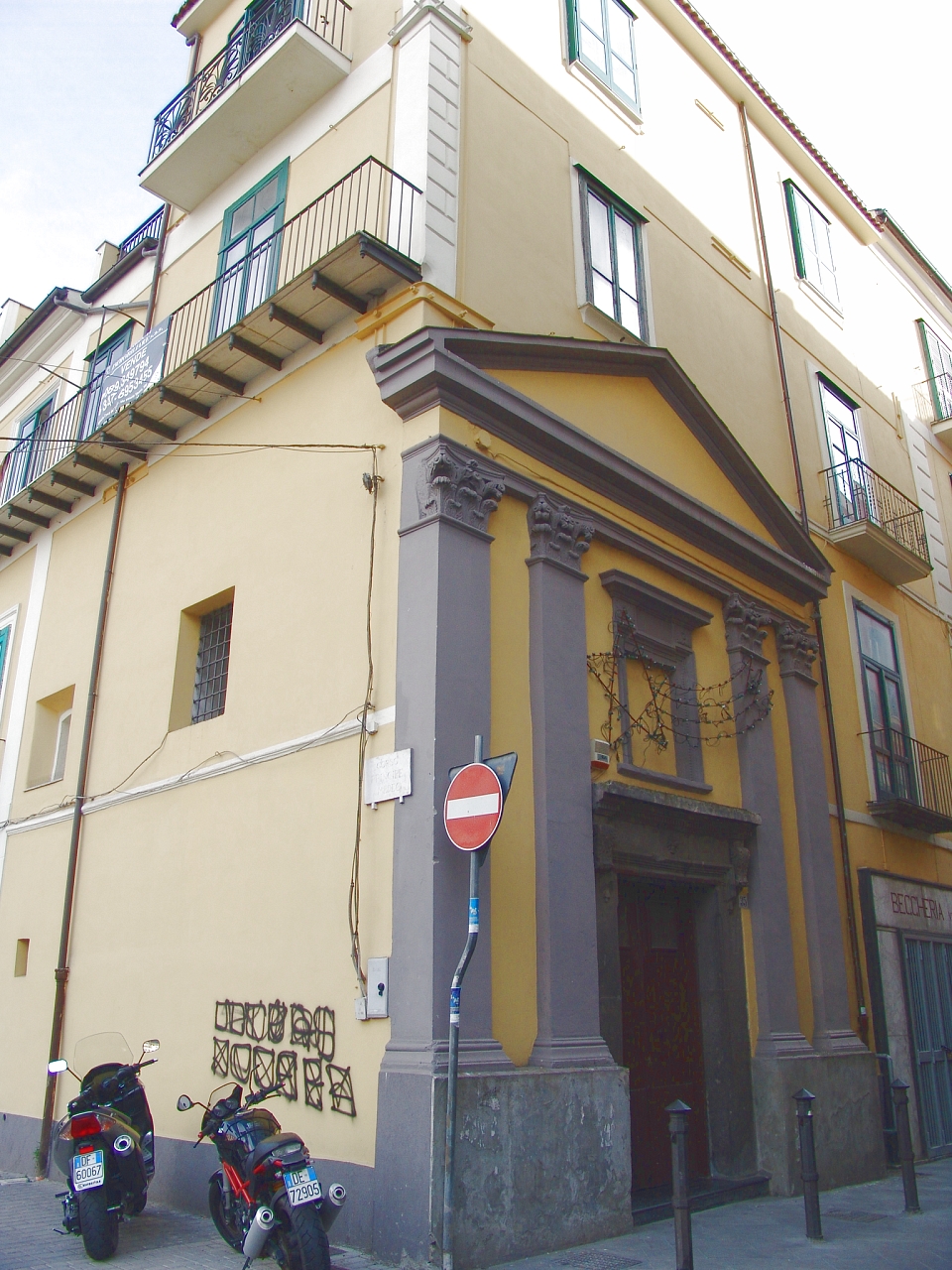 L'edificio è inserito nell'adiacente palazzo Alfieri ed è a pinta ad aula quadrangolare; strutture verticali in pietra esternamente intonacata color ocra e bianco, internamente color bianco; volta a botte; pavimento in cotto; all'esterno nicchia rettangolare con tela raffigurante la Madonna col Bambino e portale del 1500; all'interno altare in marmo con soprastante tela raffigurante la madonna con gli angeli e santi in adorazione