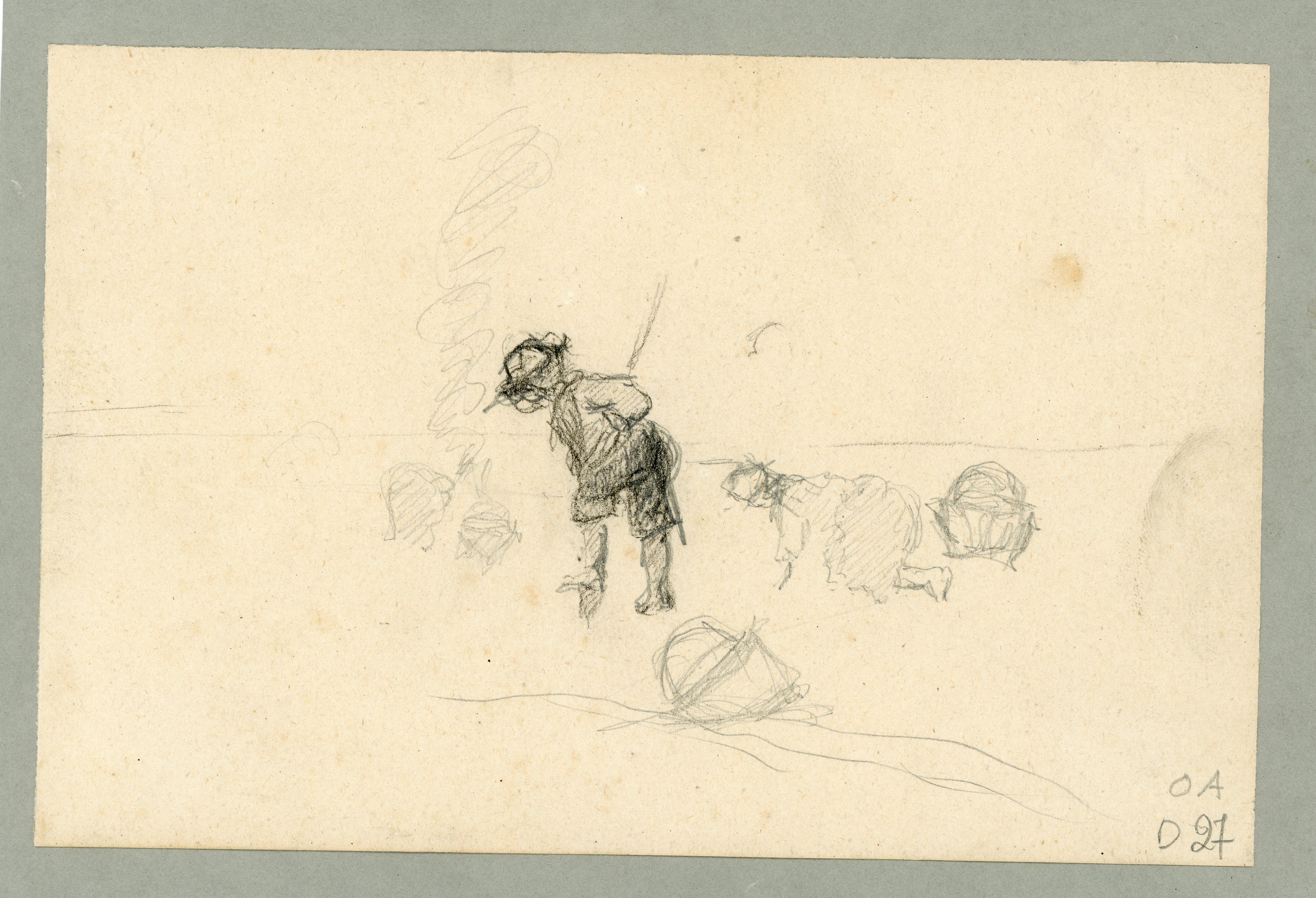 Disegno su carta. Due contadini al lavoro; in primo piano un uomo con pantaloni e cappello che vanga, in secondo piano contadina china a raccogliere qualcosa dal terreno; entrambi hanno accanto un cestino. Sullo sfondo uno schizzo di un oggetto non identificabile dal quale esce del fumo