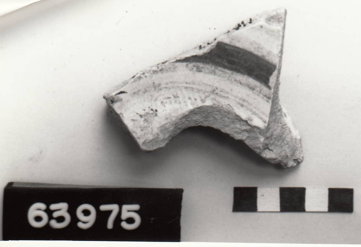Piede ad anello di piatto, formante all'esterno una gola con l'attacco della parete. Parete inclinata verso l'esterno. Impasto rosato, schiarito superficialmente, con inclusi di piccole dimensioni. Smalto bianco su entrambe le superfici. Decorazione con linea circolare in blu cobalto che racchiude un'elaborata decorazione a lustro metallico di difficile interpretazione.
