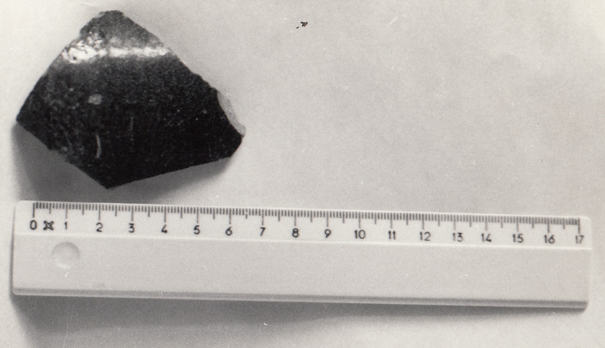 Frammento di parete di boccale subcilindrico, segni di tornitura interna. Impasto cuoio chiaro, duro, ben depurato; vetrina esterna verde, sottile, ma lucida e compatta, con solo una piccola scrostatura causata da un incluso. Cromaticamente il verde si presenta "puntinato", con una tonalità tendente all'oliva, ma con puntini di varie sfumature: chiare e scure, nonché bianche. L'interno con vetrina marrone chiaro, sottile ma lucida, trasparente.