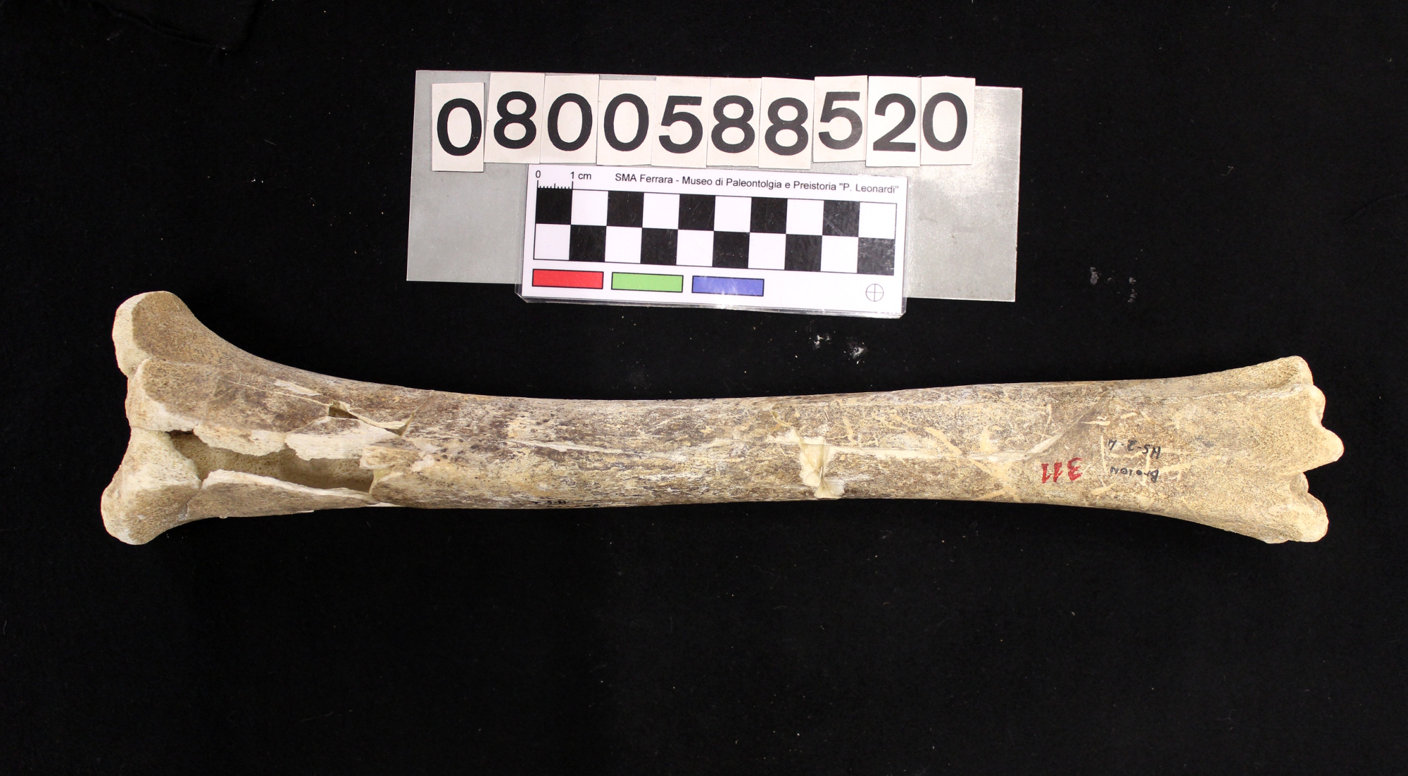 Animalia, Chordata, Mammalia, Artiodactyla, Cervidae, .tibia sinistra di individuo giovane. località di raccolta - dati storici: Europa, Italia, Veneto (Vicenza), Grotta del Broion - H.S.-2-4