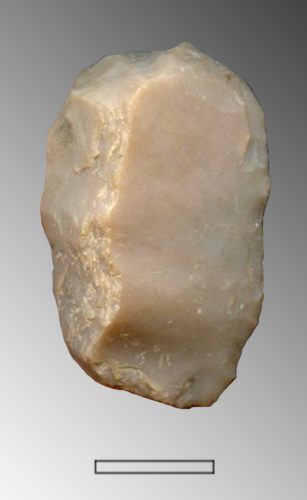 Grattatoio frontale lungo a ritocco laterale in selce di colore grigio-rosa. Il supporto di partenza è una lama spessa con sezione triangolare, tallone liscio e bulbo quasi piatto. Il ritocco è diretto, continuo, sopraelevato, scagliato-scalare all'estremità distale; diretto, continuo, semplice, a scaglie a destra; inverso, continuo, semplice, scagliato-scalare a sinistra.