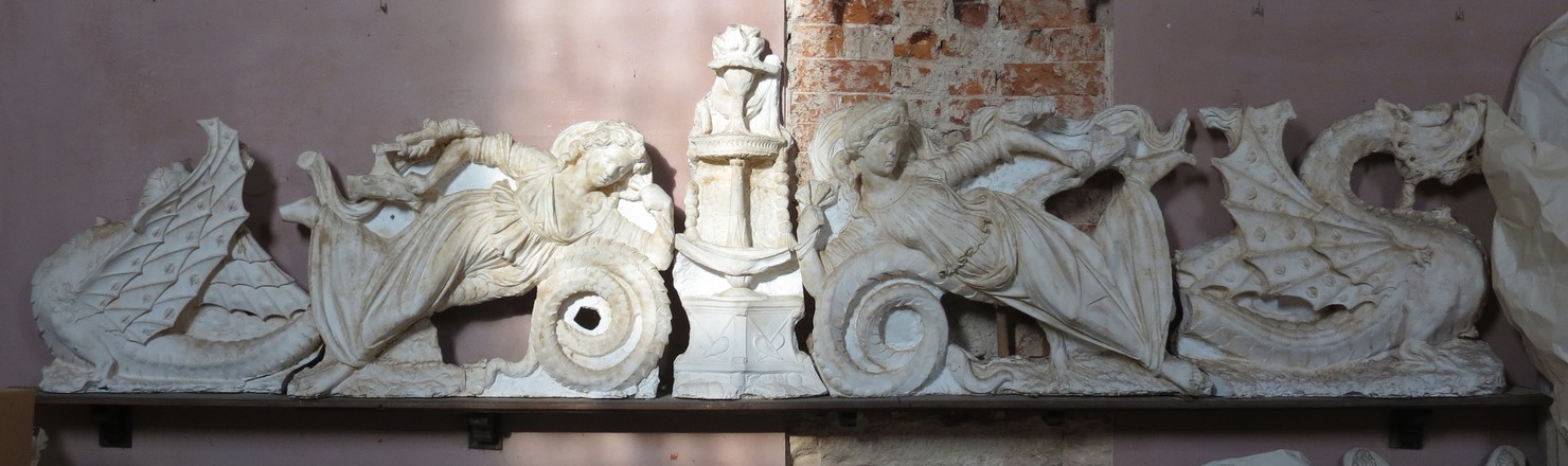 Complesso formato da 5 calchi in gesso: due draghi; due figure femminili; una candelabra centrale.. Animali fantastici: draghi. Figure femminili