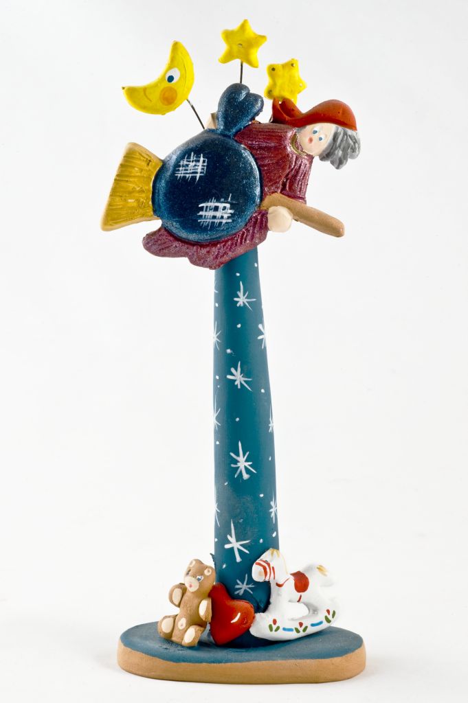 la scultura riproduce un albero dal corpo cilindrico decorato con motivi a stella bianchi su fondo blu con all'apice un cuore, una luna e stelle; una bambina cavalca una scopa. Sulla base sagomata arrotondata sono collocati un cuore, un cavallo a dondolo e un pupazzo. Il dispositivo sonoro tubolare, a forma più o meno cilindrica, è applicato dietro la figura.
