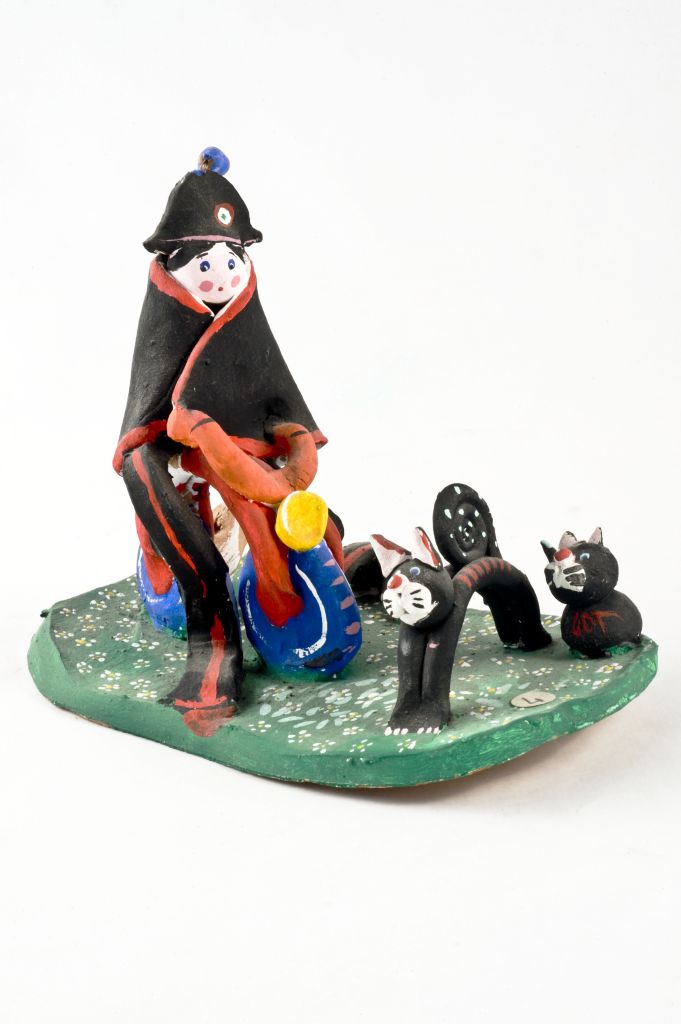 la scultura, su base sagomata arrotondata dipinta di verde con motivi a fiori bianchi e gialli, riproduce un carabiniere su una motocicletta con davanti due gatti neri nell'atto di impedirne il passaggio. Il carabiniere è in sella alla moto, le mani poggiano sul manubrio; indossa pantaloni neri con banda laterale rossa, tabarro ero con orli rossi, cappello triangolare con coccarda verde, bianca e rossa, il pennacchio è blu e rosso. Il dispositivo sonoro tubolare, a forma più o meno cilindrica, è applicato sulla base, dietro il carabiniere.