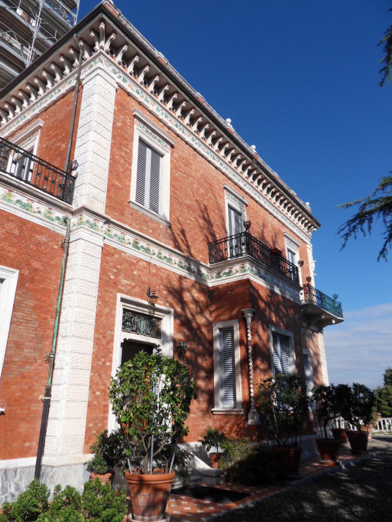 strutture verticali: parete; colonne (in muratura continua, laterizio; pietra; marmo bianco), intero bene; vano scale; strutture di orizzontamento: volta; solaio (a vela intera volta; intero solaio muratura; latero - cemento), piano terra; intero bene; coperture: piana; a tetto (semplice a n falde soletta ), ala destra; ala sinistra; scale: scala d'accesso; scalone; scala (d'accesso (esterno); principale; sussidiaria rettilinea; rettilinea spezzata; a chiocciola, marmo; marmo; marmo), esterna; interna; interna; pavimenti: in marmo; in ardesia e marmo; a parquet a motivi geometrici; a scacchiera, intero bene; atrio; intero bene; elementi decorativi: decorazioni architettoniche; decorazioni pittoriche; lucernaio dipinto (a motivi floreali; a motivi geometrici, marmo bianco; intonaco; vetro), prospetti ala est; vano scale; vano scale, esterna; interna; interna; isrizioni, lapidi, stemmi: stemma; stemma (scolpita/o; ferro battuto, marmo di Carrara; ferro), ala destra; ala destra