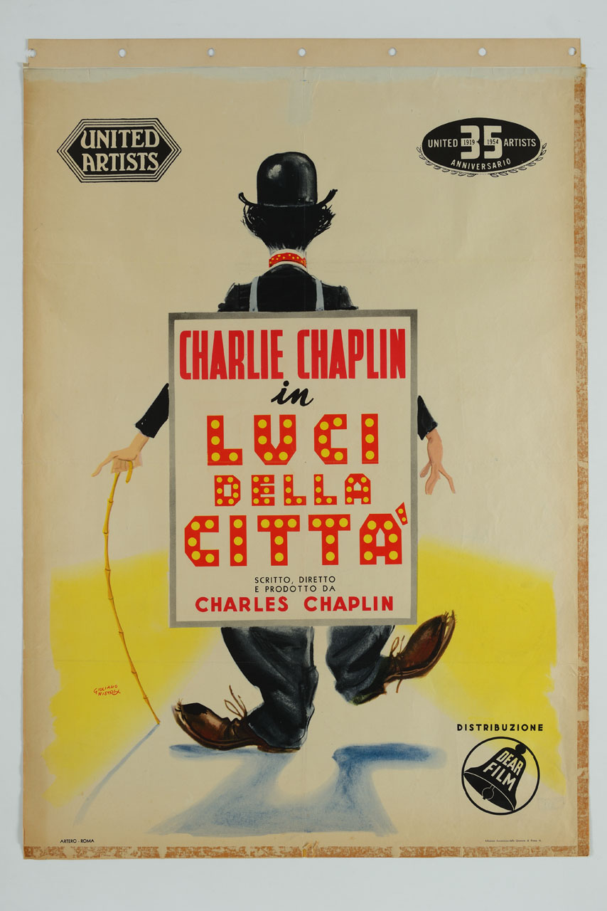 Lettura iconografica: figura maschile; comico; attore; Charlot; manifesto pubblicitario. Categoria merceologica/ tipo evento: cinema americano; cinema muto; casa di produzione cinematografica; casa di distribuzione cinematografica. Nomi: Charlie Chaplin; Charles Chaplin; Luci della Città; United Artists; DEAR Film; Distribuzione Edizioni Associate Rizzoli. Luoghi: Stati Uniti d'America; California; Los Angeles; Beverly Hills; Roma