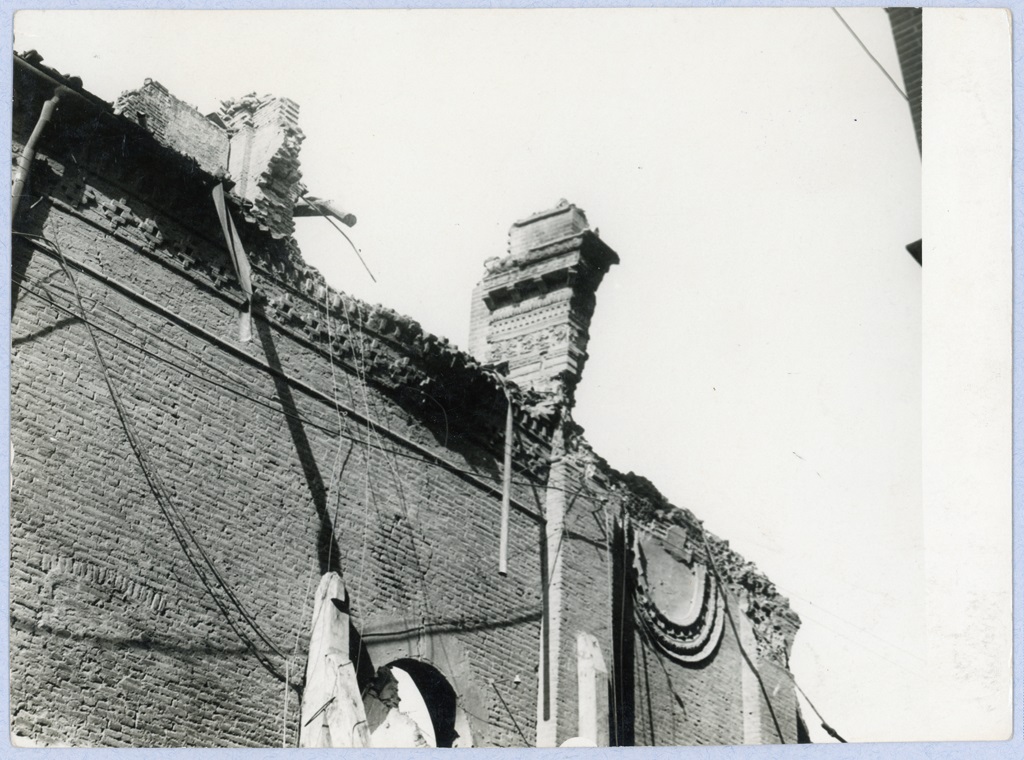 Italia - Emilia Romagna - Bologna - Santuario del Corpus Domini; Architettura - Chiese - Danni di Guerra - Guerra mondiale 1939-1945, Bologna - Santuario del Corpus Domini - Veduta della facciata nella parte mediana sinistra, dopo le distruzioni della seconda guerra mondiale (i contrafforti sono rinforzati da assi lignee)