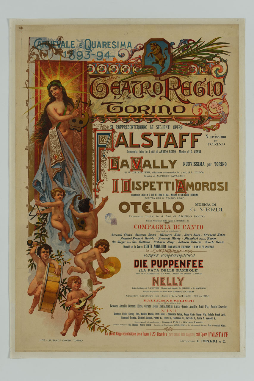 Lettura iconografica: figura femminile; musa; Melpomene; putti musicanti; lira; triangolo; piatti; tamburo, liuto; racemi vegetali. Categoria merceologica/ tipo evento: spettacolo; teatro; musica; opera lirica; balletto; stagione teatrale. Nomi: Teatro Regio; Stagione di Carnevale e Quaresima; Falstaff; Arrigo Boito; Giuseppe Verdi; La Vally; Wilhelmine de Hillern; Luigi Illica; Alfredo Catalani; I Dispetti Amorosi; Gaetano Luporini; Otello; Giulio Ricordi e C.; Ceresoli Elvira; Cisterna Emma; Monteiro Zika; Pedri Elisa; Strakosh Febea; Angelini Fornari Rodolo; Armandi Mario; Blanchart Ramon; De Negri Giovanni Battista; Tribarne Luigi; Salmasi Vittorio; Zucchi Dante; Conti Arnaldo; Baravelli Giovanni; Romei Francesco; Die Puppenfee; La Fata delle Bambole; Joseph Hassreiter; Franz Gaul; Josef Bayer; Nelly; Ferdinando Pratesi; Giovanni Olivieri; Romualdo Marenco; Enrico Carozzi; Francesco Cesarini; Bessone Amalia; Borroni Elisa; Cerato Irene; Dell'Agostini Anita; Garcia Amalia; Tatti Pia; Zucchi Severina; Cardona Linda; Garony Bice; Mariani Amelia; Puliti Anna; Benincasa Felice; Boggio Carlo; Bruneri Giovanni Battista; Cespi Luigi; Emanueli Ernesto; Ghinghini Augusto; Pratesi G.; Pulini Giovanni; Piantanida G.; Razzetto Giacomo; Tuzza C.; Zampelli V.; Ugo Gheduzzi; Alfonso Goldini; Antonio Oliviero; Bezzi e Carissimi; Impresa L. Cesari e C. Luoghi: Torino; Milano