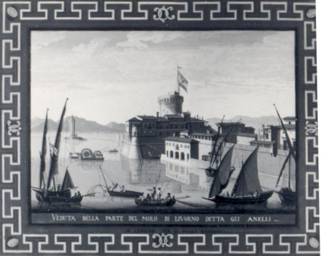 la veduta rappresenta una parte specifica del porto di Livorno, che consente di vedere sulla destra le mura medicee, il Casino di Sanità, ovvero la sede dell'autorità portuale, distrutta durante la Seconda Guerra Mondiale e la Fortezza Vecchia ristrutturata nel suo perimetro sotto Cosimo I, per volere del quale furono aggiunti i bastioni dell'Ampolletta, della Capitana e della Canaviglia. Proprio sopra quest'ultimo il Granduca volle costruirvi il proprio palazzo. Ben evidente sul bastione è lo stemma dei Medici, scudo ovale con sei palle lungo il perimetro. In lontananza l'elegante Torre difensiva del Marzocco a pianta ottagonale. In primo piano imbarcazioni a vela e pescherecci. In particolare su quella di sinistra sventola la bandiera della Repubblica di Genova, la croce rossa su campo bianco. Come descrive l'iscrizione in basso quest'area del porto è il molo, uno dei tre del porto mediceo, denominato degli Anelli, detto anche braccio Ferdinando. Il dipinto è contornato da una cornice bianca, con contorni rossi e neri su sfondo blu. La cornice in legno dorata è originale.. Veduta: Livorno: porto di Livorno. Figure. Architetture: Livorno: molo degli Anelli; braccio di Ferdinando; fortezza vecchia; mastio di Matilde; mura medicee; casino di Sanità; palazzo dell’Autorità portuale; torre del Marzocco. Oggetti: bandiera dei Lorena; bandiera della Repubblica di Genova. Mezzi di trasporto: imbarcazioni a vela; pescherecci; chiatta