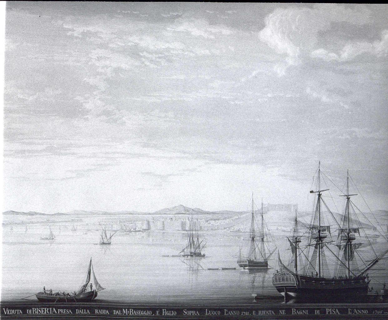 secondo quanto indicato nell’iscrizione il dipinto raffigura il porto vecchio della città di Biserta, città della Tunisia settentrionale che si affaccia sul mar Mediterraneo, ripreso dalla rada. La veduta ritrae sullo sfondo la zona del porto vecchio della città di cui si vede la possente fortificazione muraria. In primo piano invece, nella zona della rada utilizzata per l'ancoraggio delle navi, un elegante vascello a tre alberi ripreso verso lo specchio di poppa. Sulla sinistra un’imbarcazione più piccola con figure a bordo e altre imbarcazioni sullo sfondo. La carta probabilmente è smarginata e taglia la greca tipica dei Baseggio.. Veduta: Tunisia: Biserta; porto vecchio. Architetture: Biserta: mura; fortificazioni. Mare: mar Mediterraneo. Mezzi di trasporto: imbarcazioni; vascello. Figure