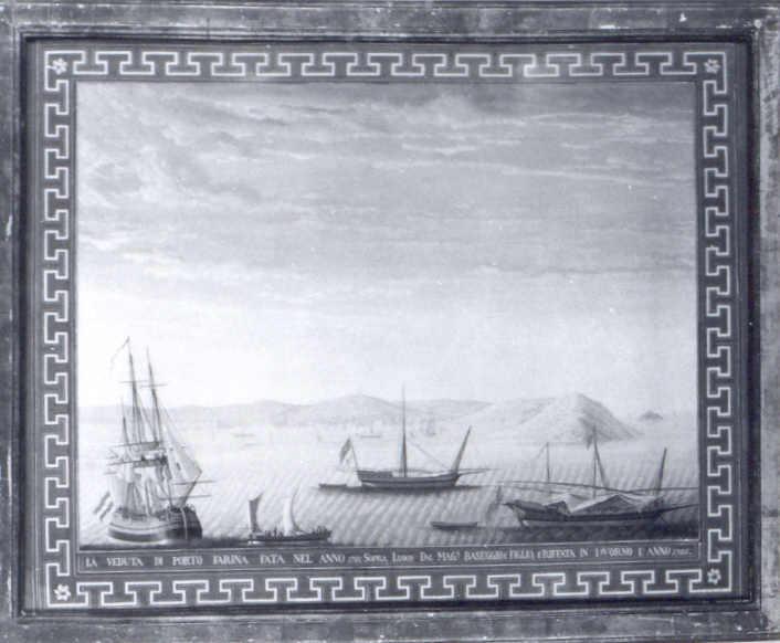 secondo quanto indicato nell’iscrizione il dipinto raffigura il porto della città di Ghar El Melh, una cittadina situata a nord della Tunisia, anticamente nota come Porto Farina, affacciata sul mar Mediterraneo. In primo piano alcuni velieri, alcuni con vele parzialmente aperte, altri con vele ammainate. Sul grande veliero a sinistra sventola la bandiera olandese, tricolore con tra bande orizzontali, blu, bianca e rossa, a cui si affianca un’imbarcazione più piccola con equipaggio. Al centro un secondo veliero con la bandiera della Tunisia (luna e stelline su campo rosso) e sulla destra un terzo veliero con la bandiera genovese (croce rossa su campo bianco). Sullo sfondo le colline e altre imbarcazioni in mare. L'opera e l'iscrizione sono contornate da una greca bianca con contorni rossi e neri su sfondo blu. La cornice in legno dorato rettangolare è originale.. Veduta: Tunisia: Ghar El Melh: porto di Ghar El Melh; Porto Farina. Mare: mar Mediterraneo. Figure. Mezzi di trasporto: imbarcazioni; velieri. Oggetti: bandiere; bandiera della Tunisia; bandiera olandese; bandiera genovese. Paesaggio: montagne