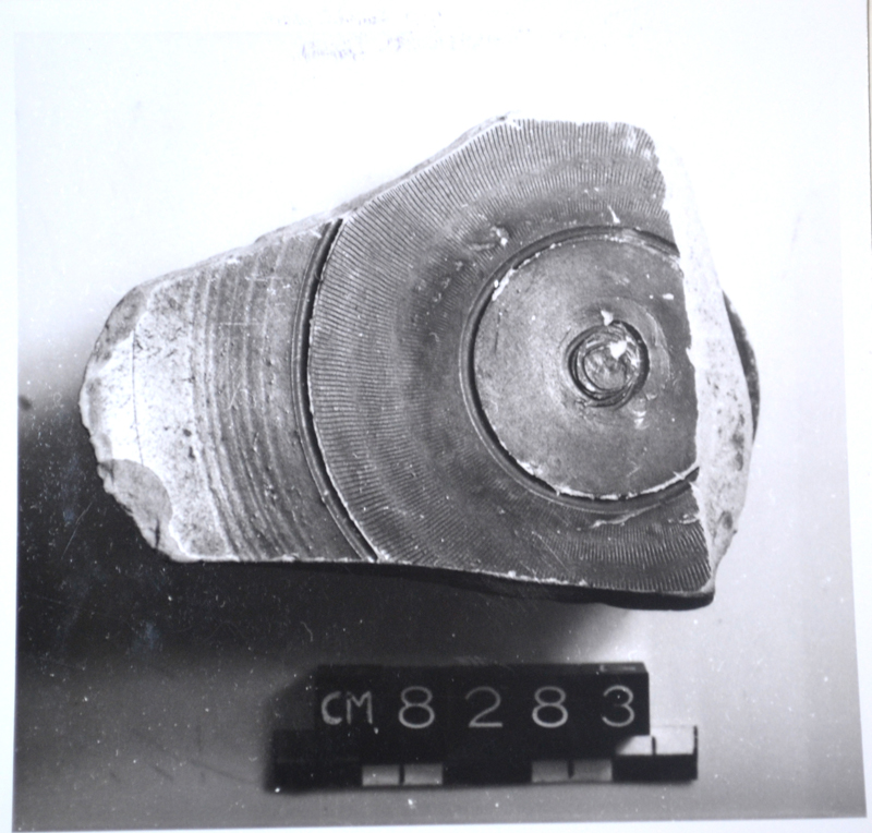 Piede con gola e spigolo esterno arrotondato; fondo piano e attacco delle pareti. Sul fondo cerchietto impresso malamente a mano e larga fascia di finissime striature a rotella entro due scanalature concentriche. Forma non precisabile. Produzione etrusco romana.