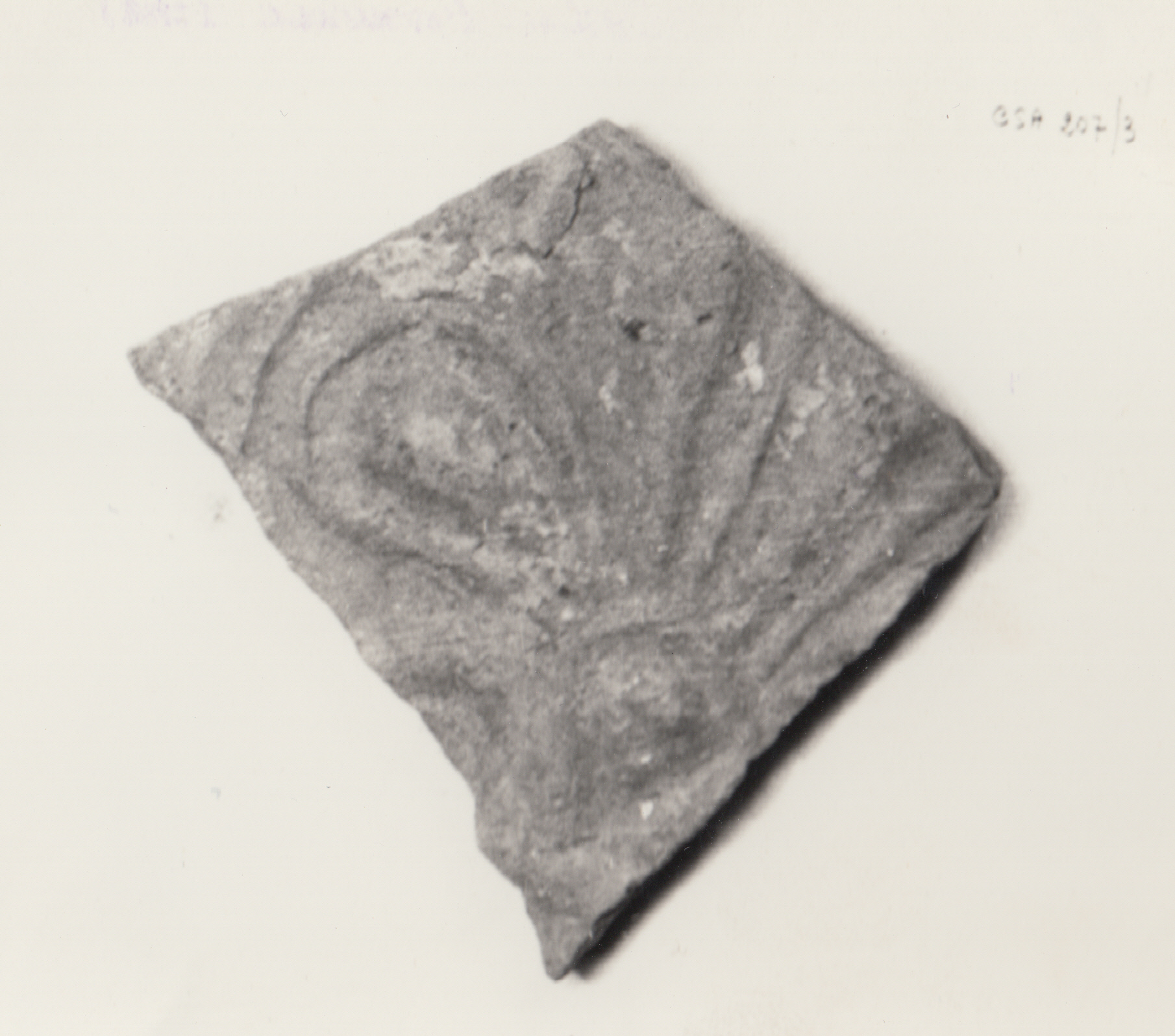Frammento di cortina pendula. La lastra completa risulta distinta in due zone, la prima con strigilature, la seconda costituita da un campo decorato da serie di palmette incrociate e marginate da cordone depresso e serpentiforme. Le palmette hanno cinque petali e ciascuna fuoriesce da un calice a forma di ventaglio. Argilla classe A, tipo 1.