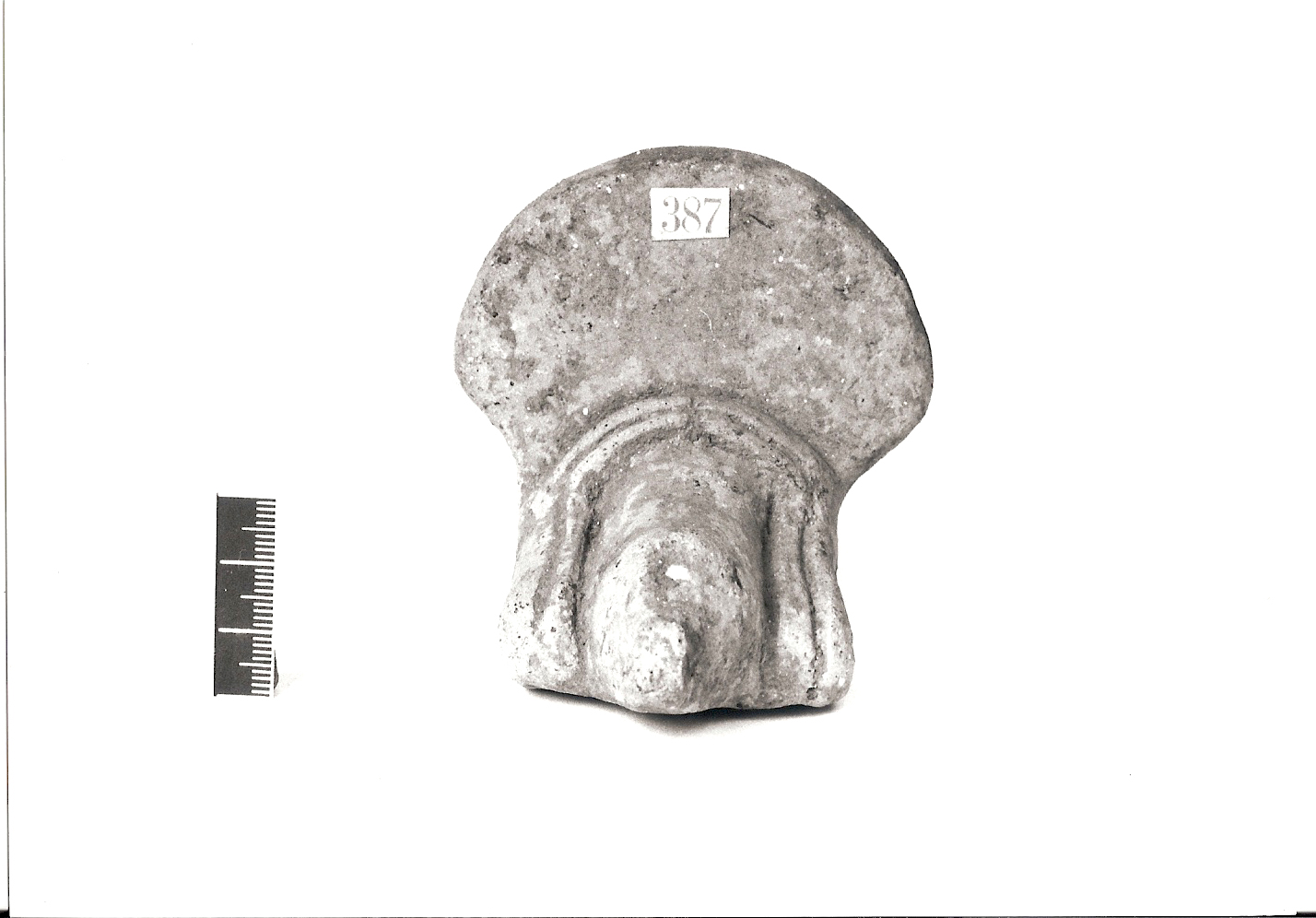 Ex-voto a forma di organo genitale maschile. Il monte del pube è triangolare e disposto ad angolo retto rispetto al pene, semieretto e con prepuzio fimotico. Una doppia solcatura separa il pene dallo scroto e dai testicoli, piccoli e resi in maniera molto schematica. La dedica di fittili riproducenti le parti del corpo umano funzionali alla procreazione sembra essere legata sia alla richiesta di potenza sessuale e di fertilità, sia come intervento di natura medica, soprattutto nel caso di organi maschili con accentuata fimosi. Dal momento che non è possibile, sulla base di elementi stilistici, fornire una successione cronologica per questa tipologia di materiale alquanto schematica e di produzione seriale, la datazione può essere soltanto generica e comprendere l'intero arco temporale della loro attestazione nei complessi votivi, che va dal IV al II secolo a. C.