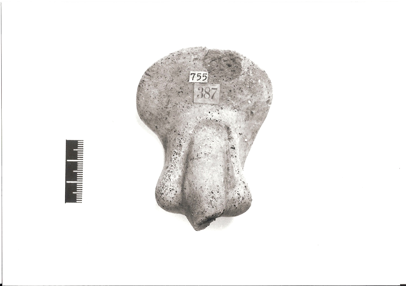 Ex-voto a forma di organo genitale maschile. Il monte del pube è arrotondato con piega rigonfia all'attacco del pene, prolungata fino allo scroto che avvolge i testicoli, piccoli e distanziati. Pene semieretto con estremità spezzata. La dedica di fittili riproducenti le parti del corpo umano funzionali alla procreazione sembra essere legata sia alla richiesta di potenza sessuale e di fertilità, sia come intervento di natura medica, soprattutto nel caso di organi maschili con accentuata fimosi. Dal momento che non è possibile, sulla base di elementi stilistici, fornire una successione cronologica per questa tipologia di materiale alquanto schematica e di produzione seriale, la datazione può essere soltanto generica e comprendere l'intero arco temporale della loro attestazione nei complessi votivi, che va dal IV al II secolo a. C.