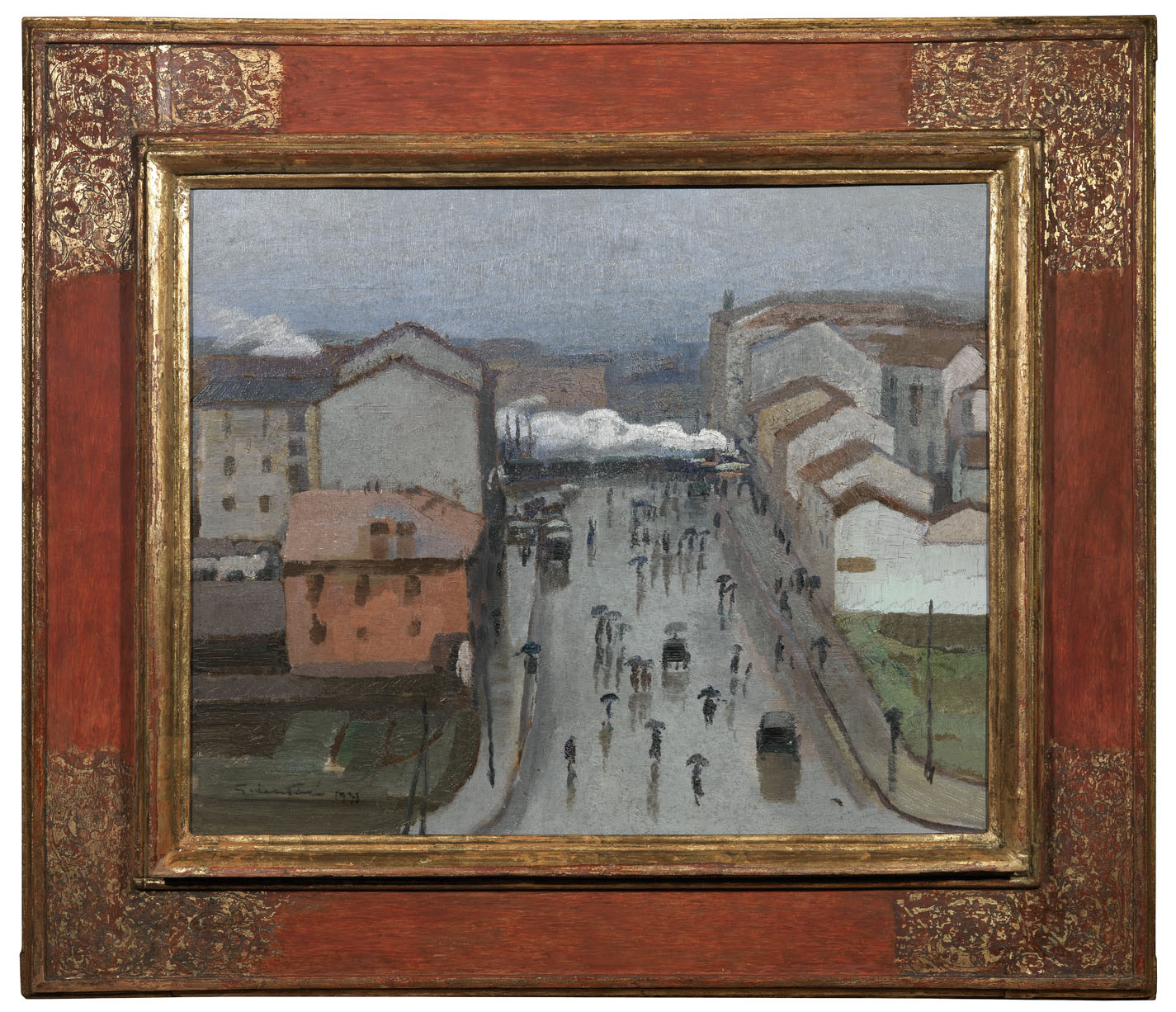 Dipinto a olio su tela con cornice in legno dipinta e dorata.. Dipinto raffigurante la veduta di strada cittadina con sullo sfondo un treno