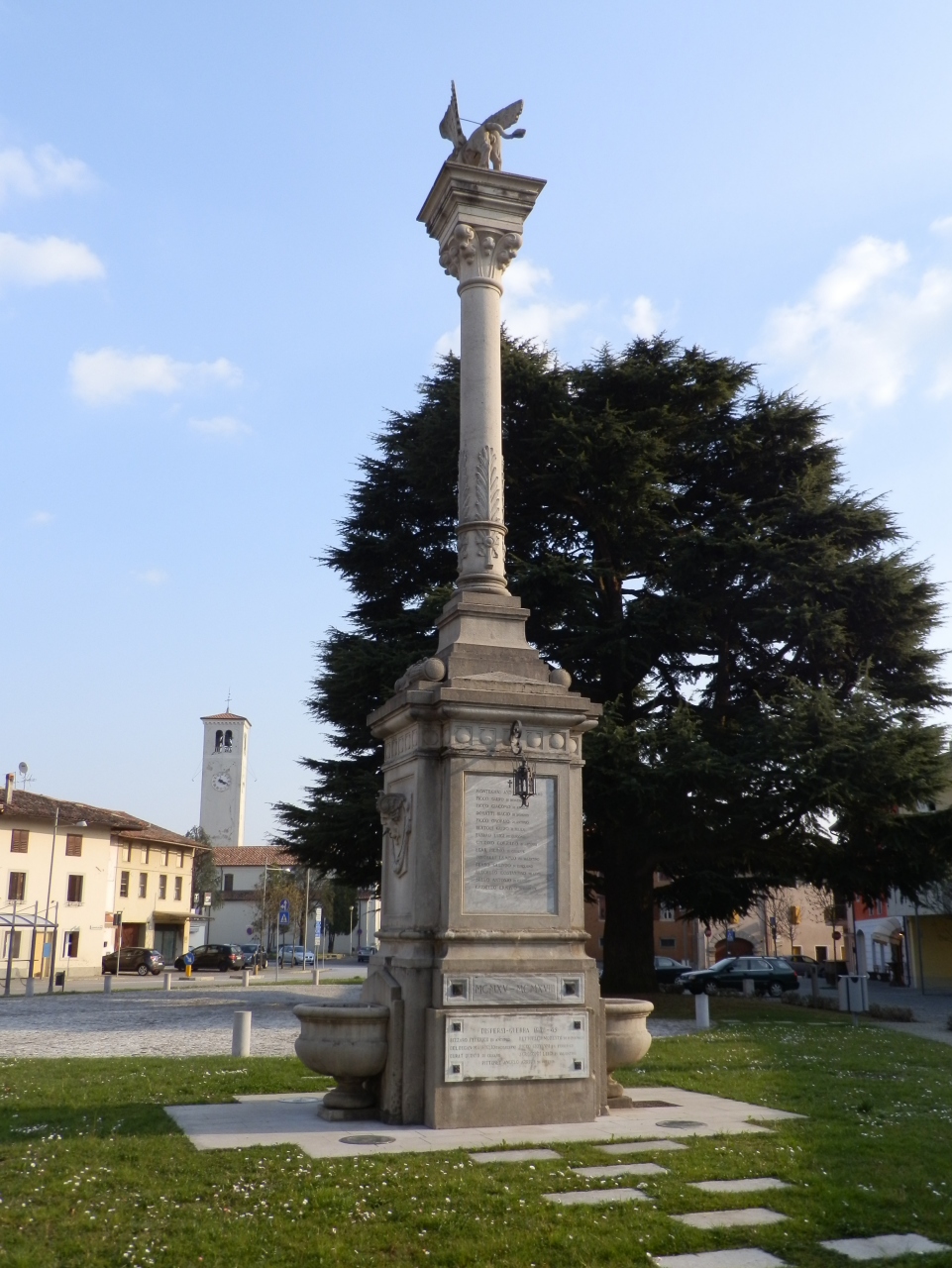Il monumento è situato nella piazza principale a nord, in un'area a prato. L'area di rispetto è definita da una pavimentazione lastricata. A pianta rettangolare è strutturato su schema bifacciale classiccheggiante. Uno zoccolo che poggia direttamente a terra presenta sui quattro lati degli elementi a parasta leggermente aggettanti che strutturano tutta la parte bassa. Una cornice modanata definisce il podio soprastante caratterizzato da un'esplicita forma ad ara coronato da cornice a scudi riquadrati, elementi svasati a falda disposti frontalmente ed altri a voluta, lateralmente. Sulle facce frontali sono fissate le lapidi principali con ognuna una lantena centrale a motivo floreale in ferro battuto pendente dalla cornice soprastante. Ai fianchi, dei volti in altorilievo antropomorfi con ali, posti all'interno di festoni, rilasciano dalla cannella fuoriuscente dalla bocca, l'acqua per le vasche delle fontanelle a coppa semicircolari poste ai fianchi sullo zoccolo basale. Sopra, su alcuni rialzi si eleva la colonna a fusto liscio con capitello composito a motivo floreale. La colonna sostiene su un pulvino modanato la figura scultorea del leone marciano con libro aperto. Una sottile fascia sul fusto della colonna, fissa quattro rami di palma in bassorilievo posti verticalmente.. Simboli: San Marco. Attributi: (San Marco) leone alato; libro aperto