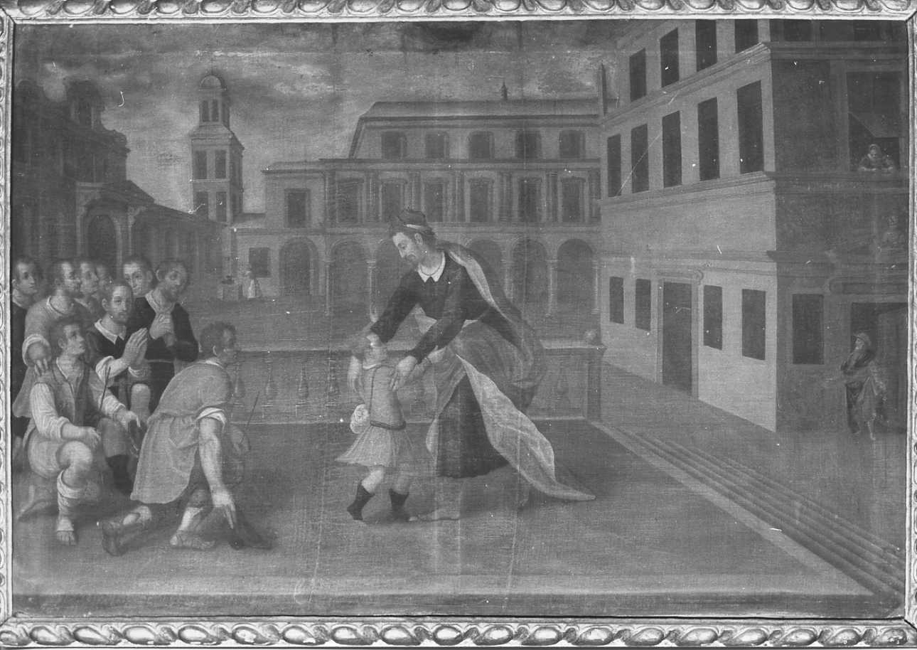 In una piazza circondata da edifici di tipo rinascimentale, dalle muratura di colore rosato, con profilature grigie, nello sfondo a sinistra, è una donna al pozzo, a destra una donna si affaccia alla finestra, mentre un vecchio esce da una porta sopra la quale è un frontone con un busto. Giuseppe, che abbraccia Beniamino, in veste gialla, ha un manto rosso con interno giallo, sopra una veste nera. A sinistra è il gruppo dei fratelli, con vesti gialle e nere.. Soggetti sacri. Personaggi: Giuseppe; Beniamino; fratelli; figure femminili. Abbigliamento. Paesaggi. Costruzioni: piazza; pozzo. Fenomeni metereologici: nuvole